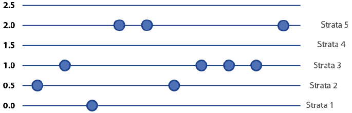 You can see dots on the zero line, the 0.5 line, the 1.0 line, and the 2.0 line, but none of the dots on the 1.5 line. You still have five strata, even though you do not see any of the dots on the 1.5 line. There could be a dot on the 1.5 line – and there would eventually be – if we were to continue to gather data.